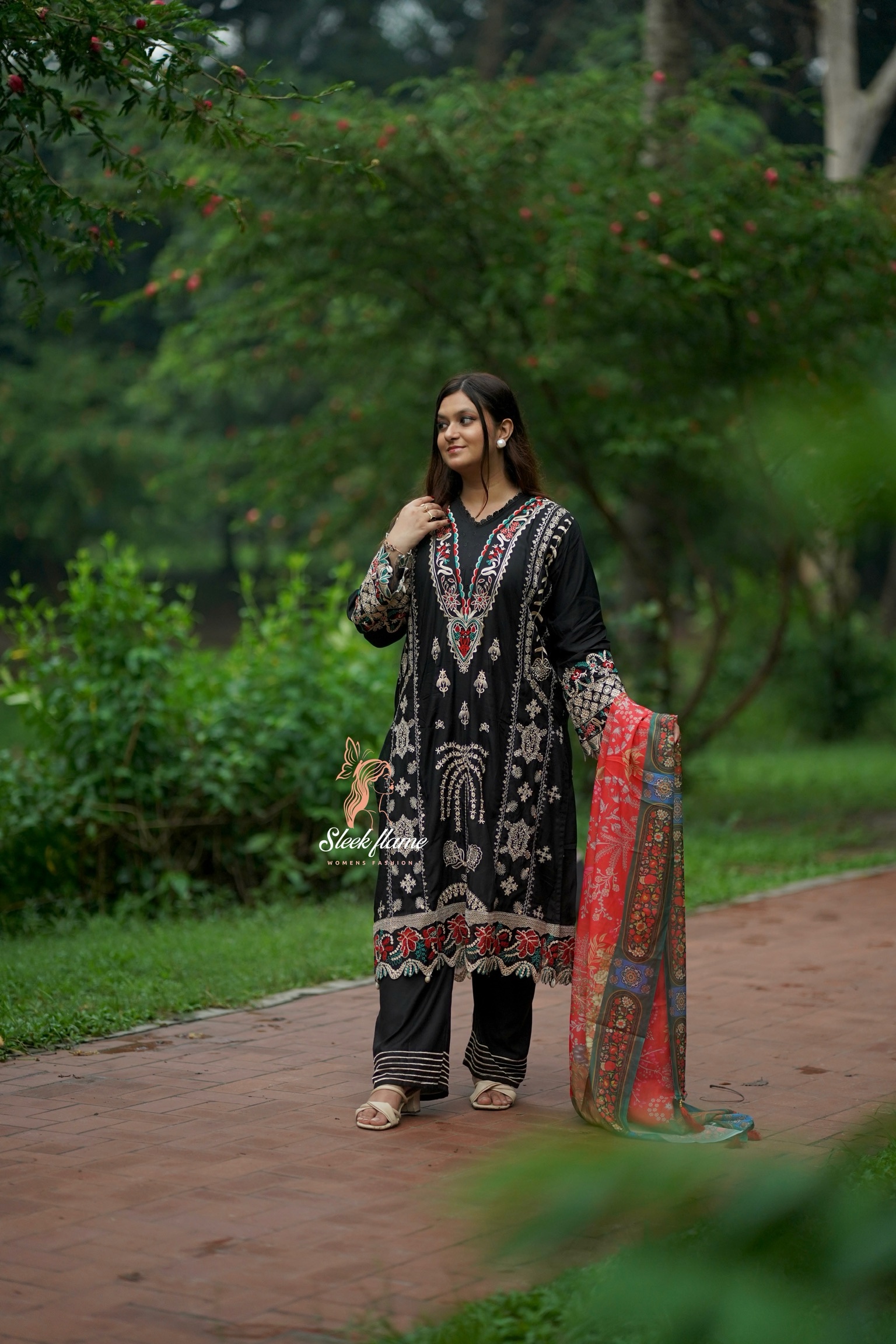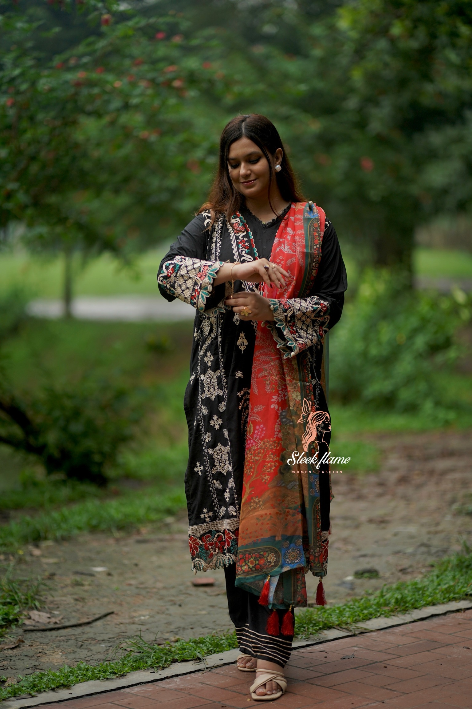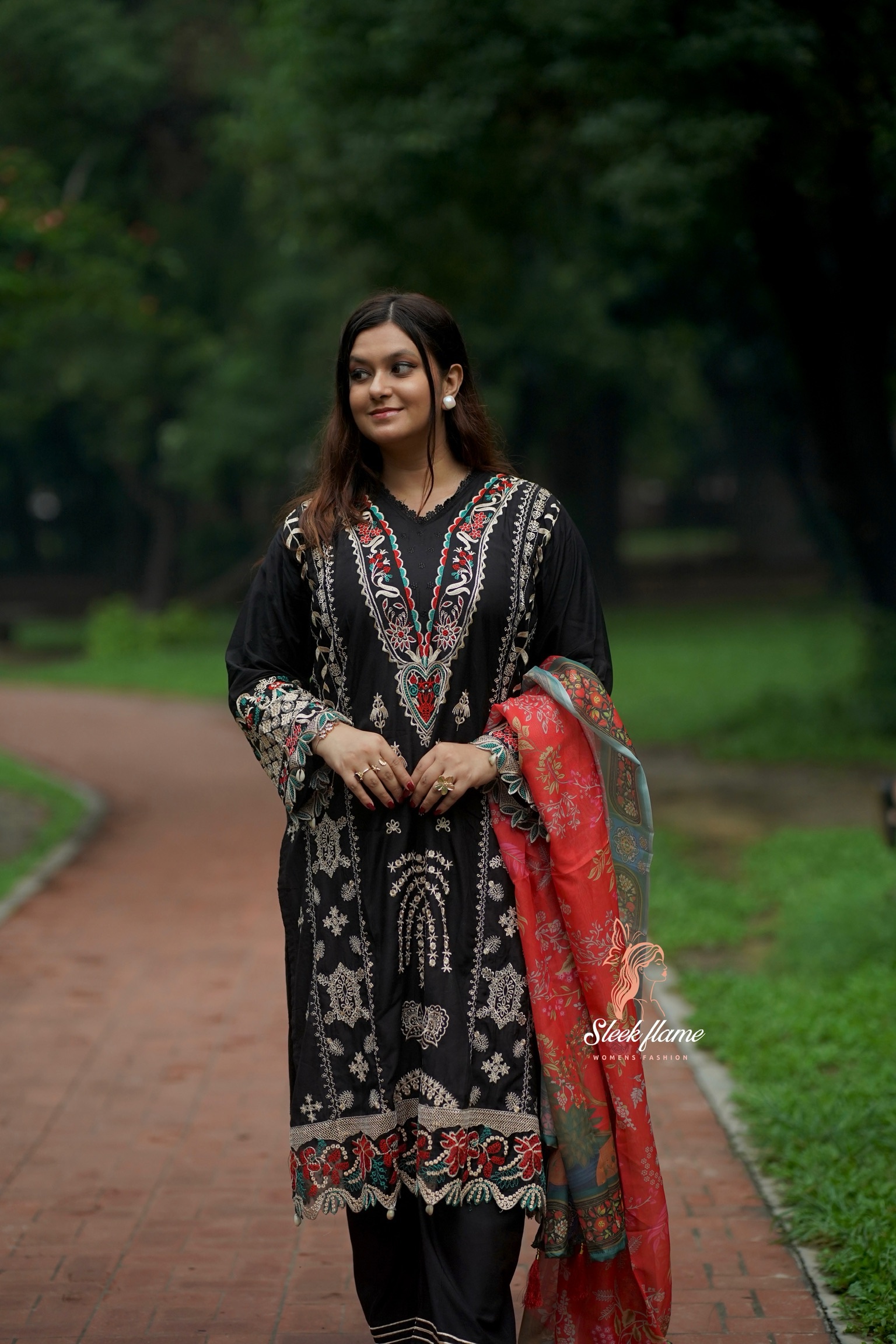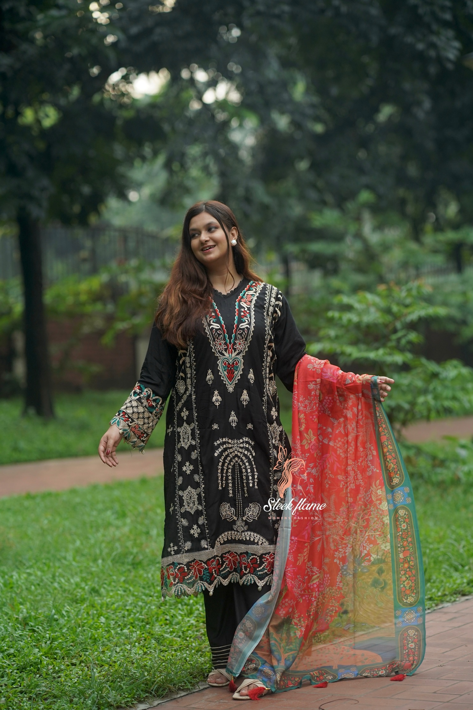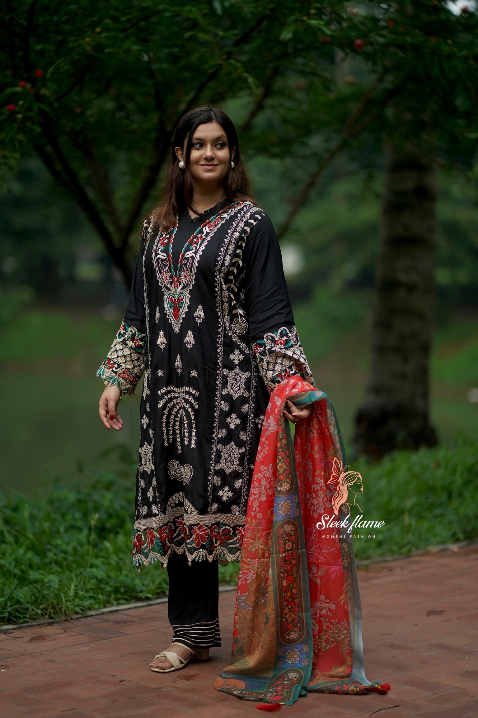 Dress front back all over embroidery work. Pant layered with embroidery work