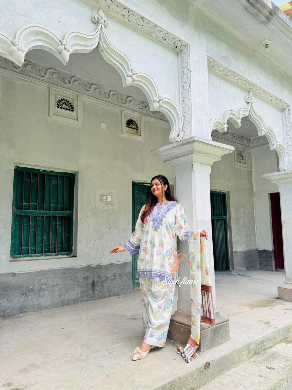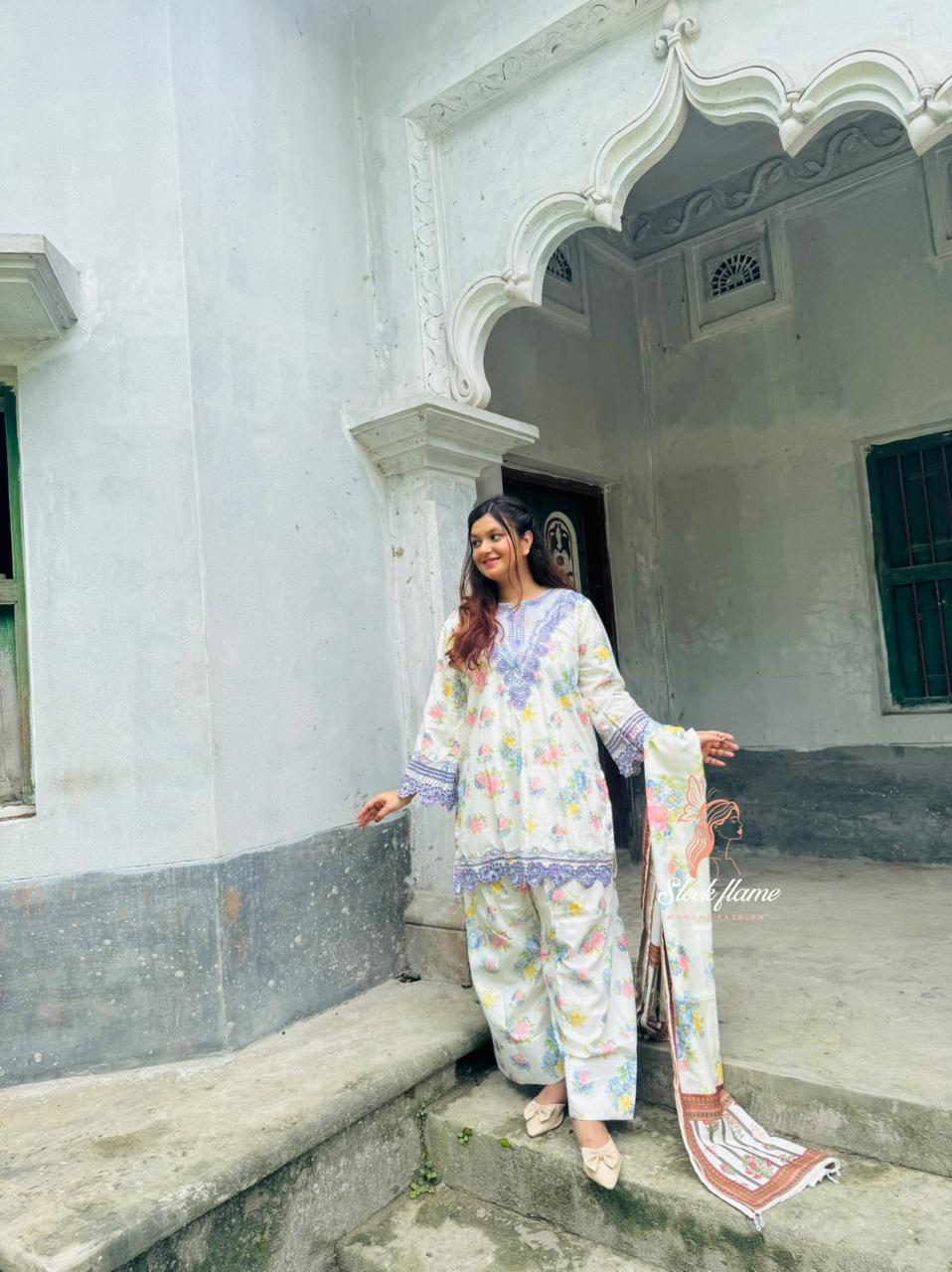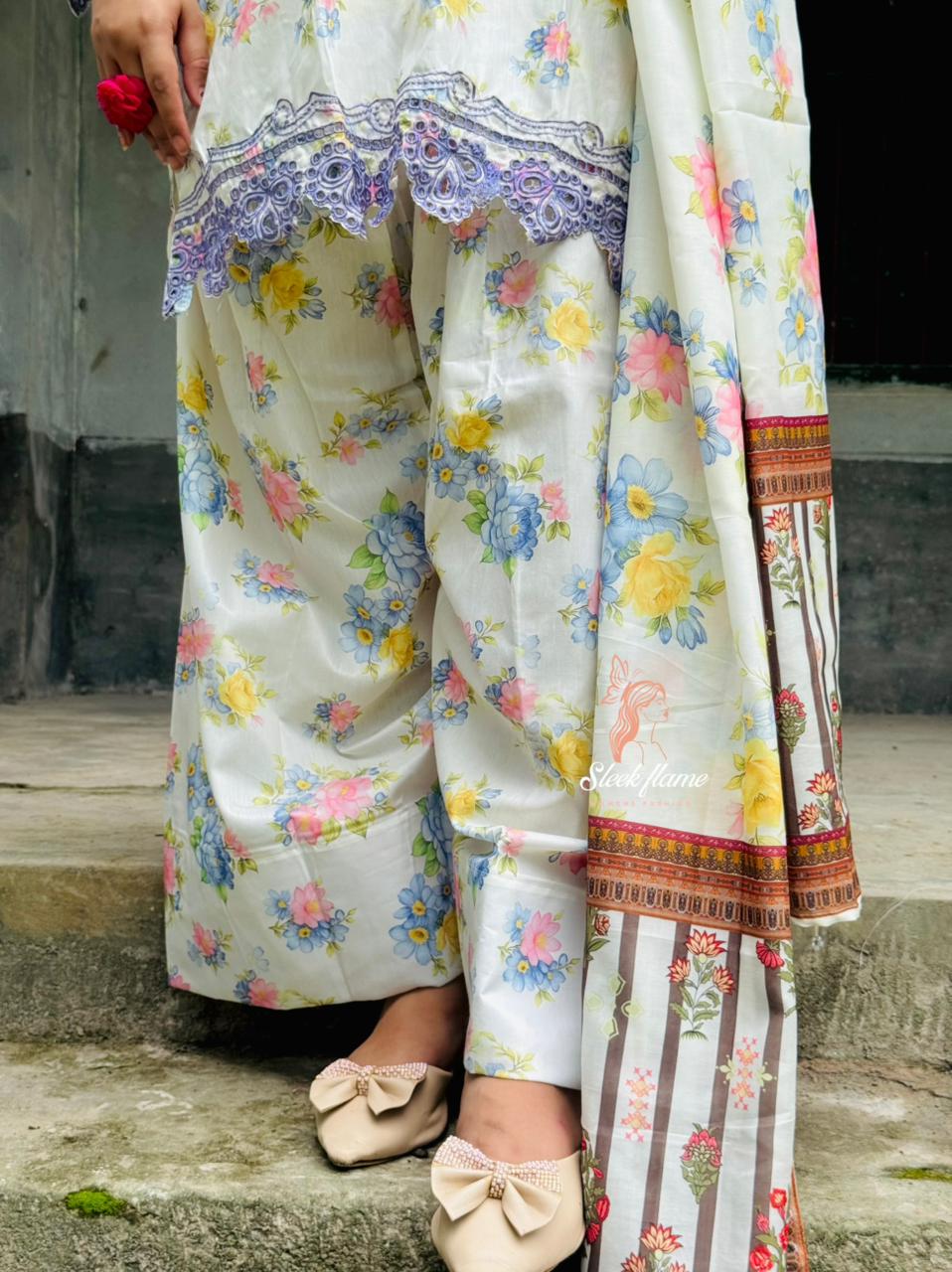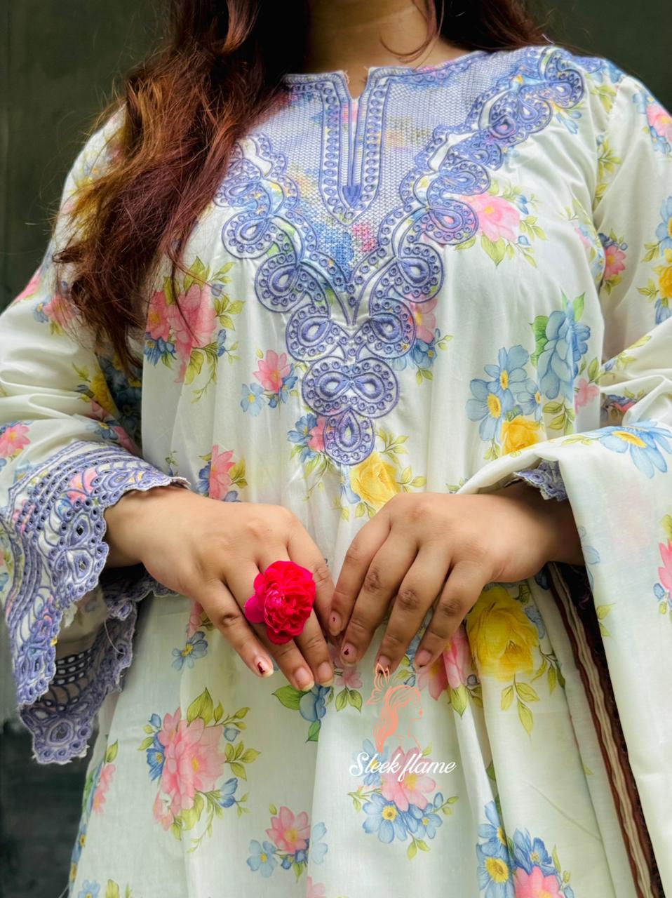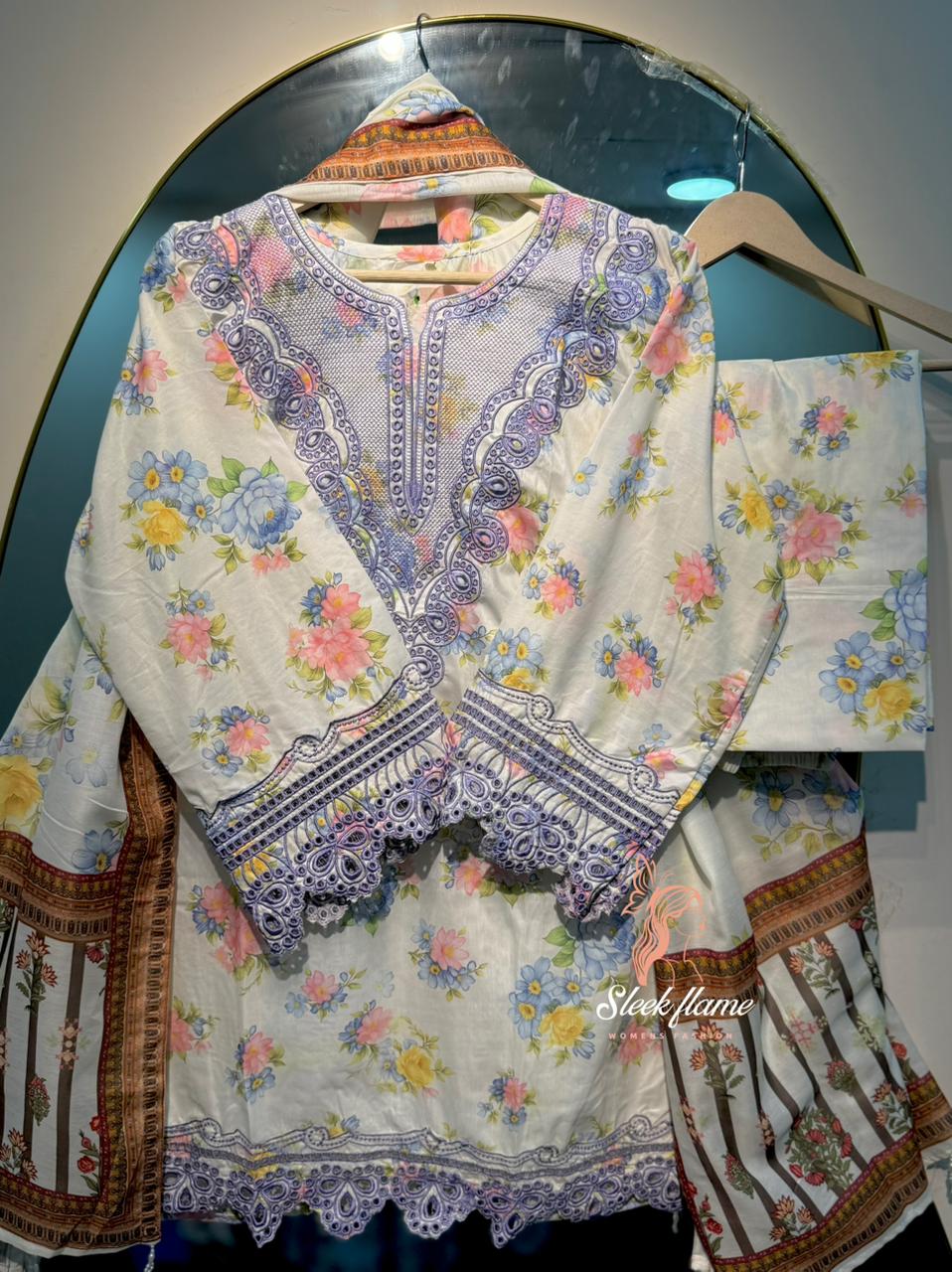 Beautiful floral Print On cotton fabric with embroidery and cutwork