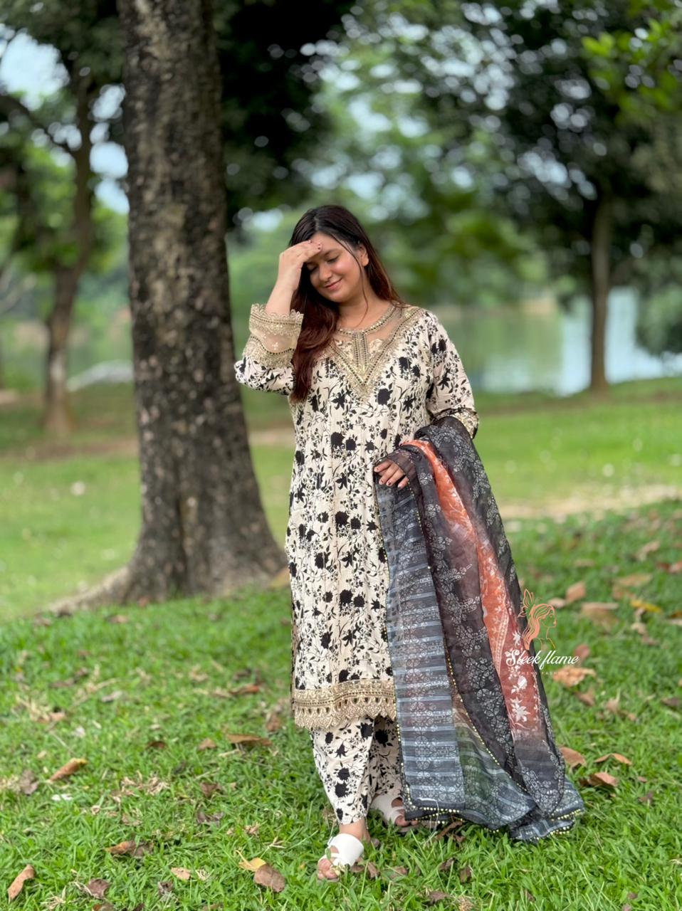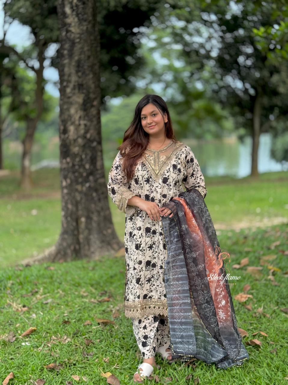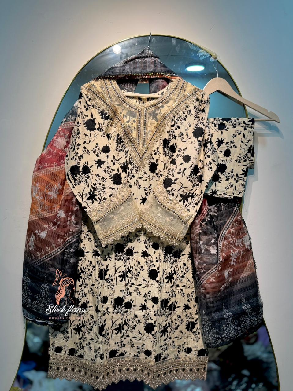 Readymade 3ps with designer neck portion worked with net panel. All over dress sequence work