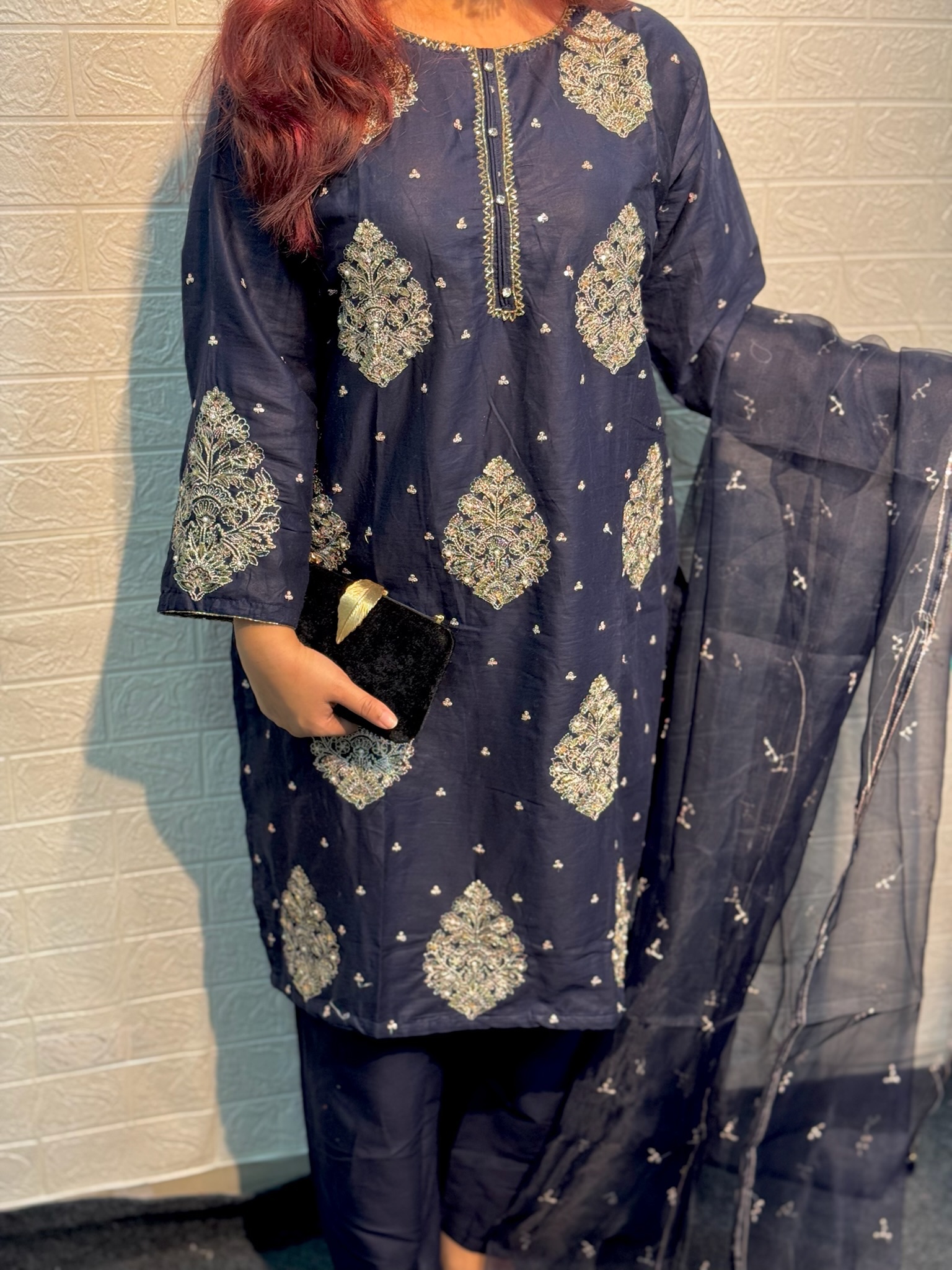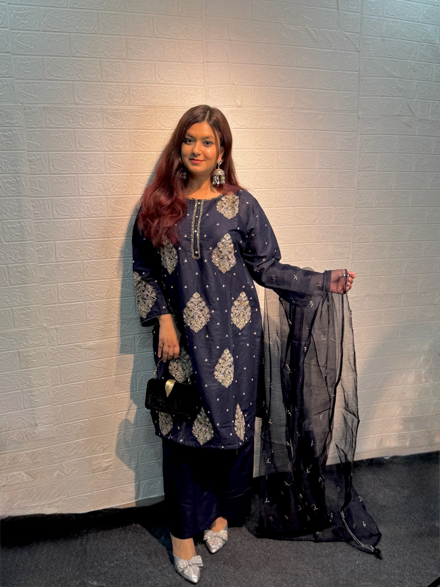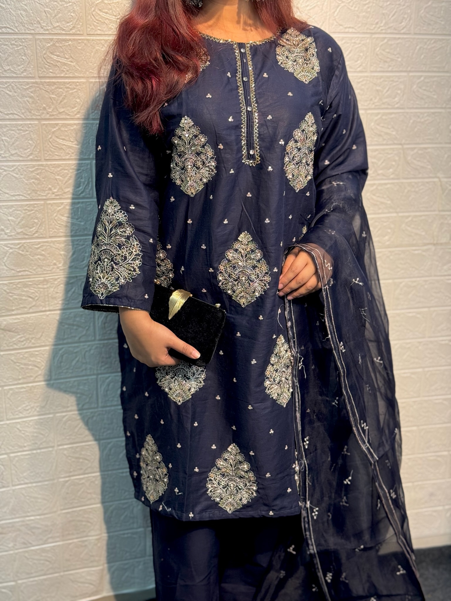 Material: Cotton with jori embroidery work on all over body. Karchupi katdana pearl work on whole dress.