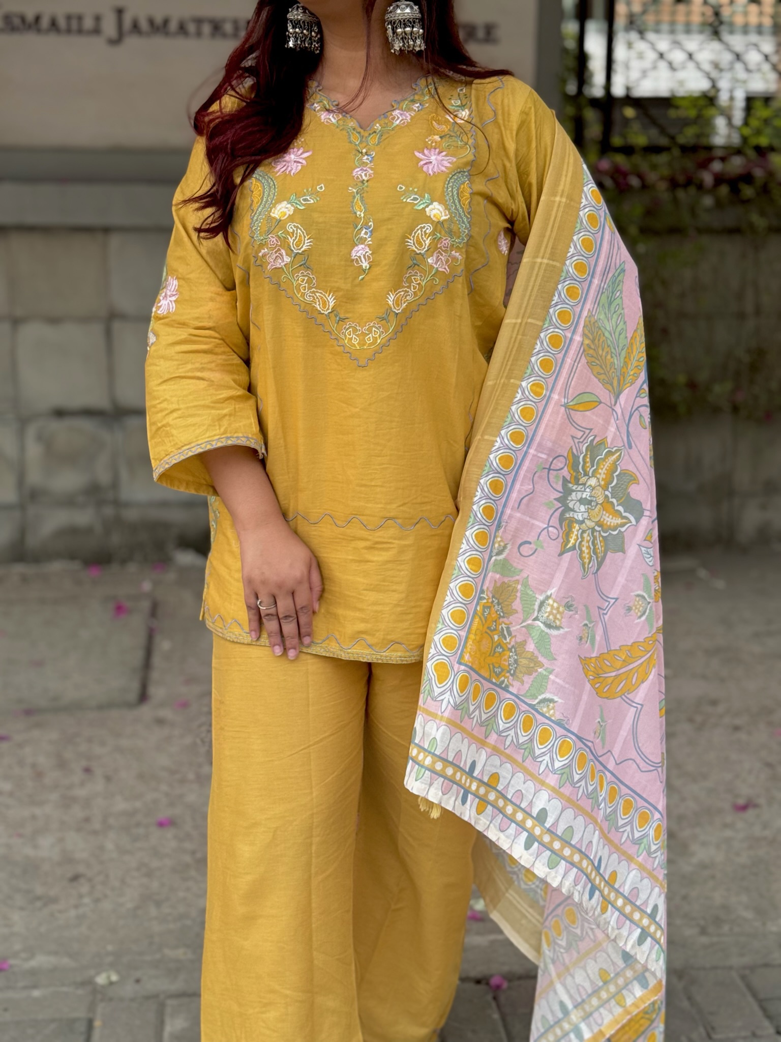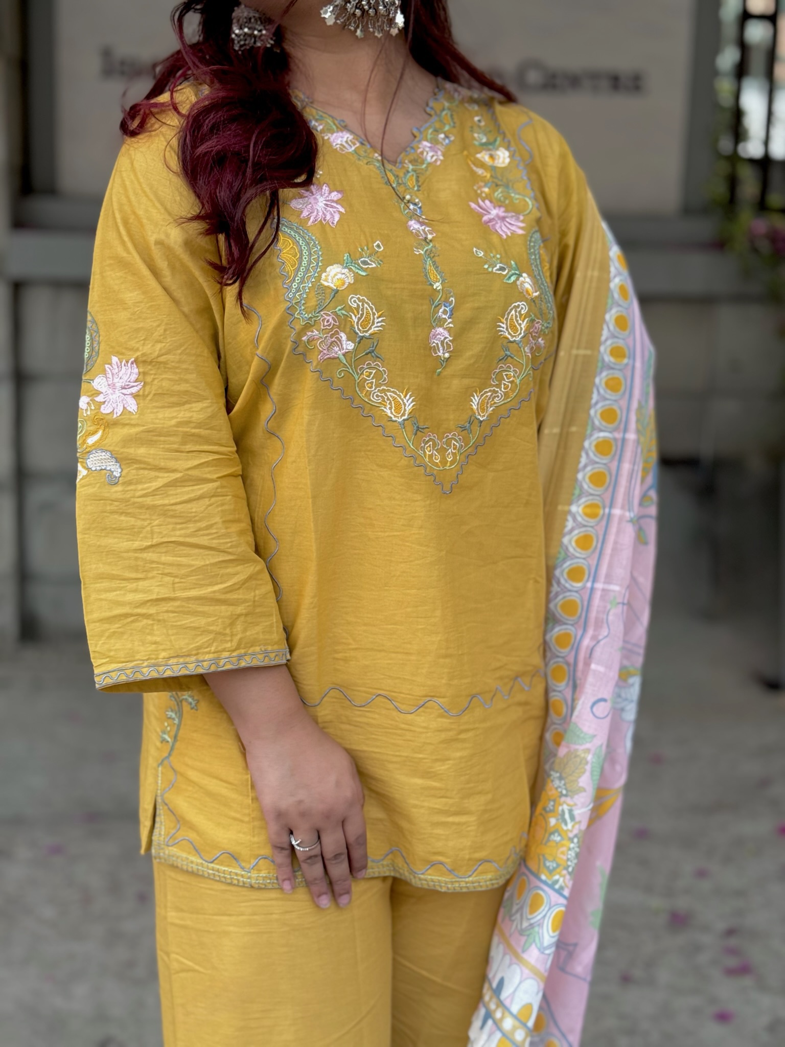 Material: Cotton with embroidery work on neck, sleeves and damaan. Cotton loose pant with embroidery work.